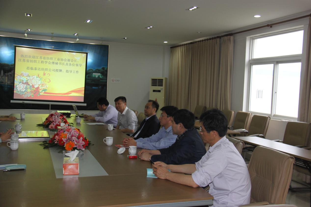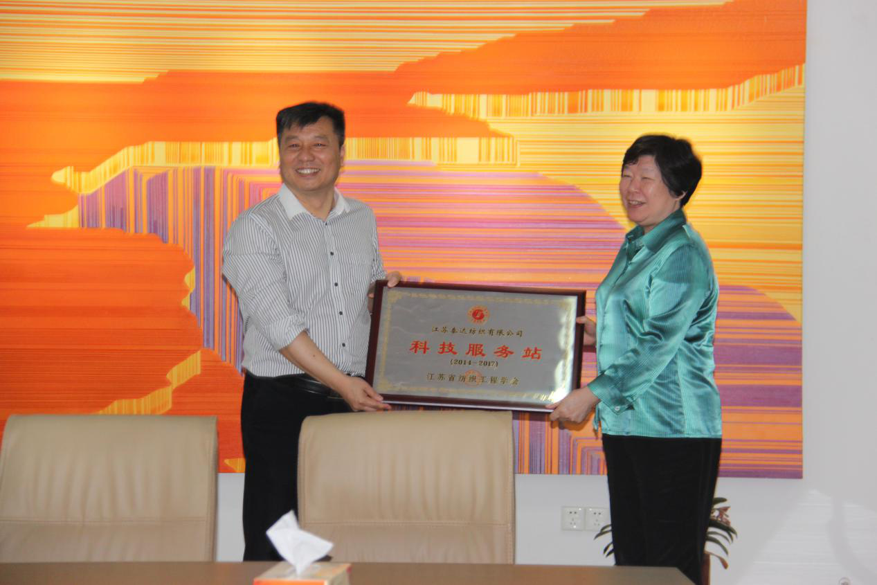 2016年5月27日上午11時(shí),省紡織工業(yè)協(xié)會(huì)謝明會(huì)長(zhǎng)、省紡織工程學(xué)會(huì)傅瑞華秘書(shū)長(zhǎng)、江南大學(xué)服裝學(xué)院謝春萍教授親臨江蘇泰達(dá)紡織有限公司授給“科技服務(wù)站”牌匾,授牌儀式由省紡織工程學(xué)會(huì)傅秘書(shū)長(zhǎng)主持,泰州市科協(xié)竺大明主席、姜堰區(qū)科協(xié)何劍主席、泰達(dá)公司總經(jīng)理彭勃等相關(guān)負(fù)責(zé)人參加授牌儀式。